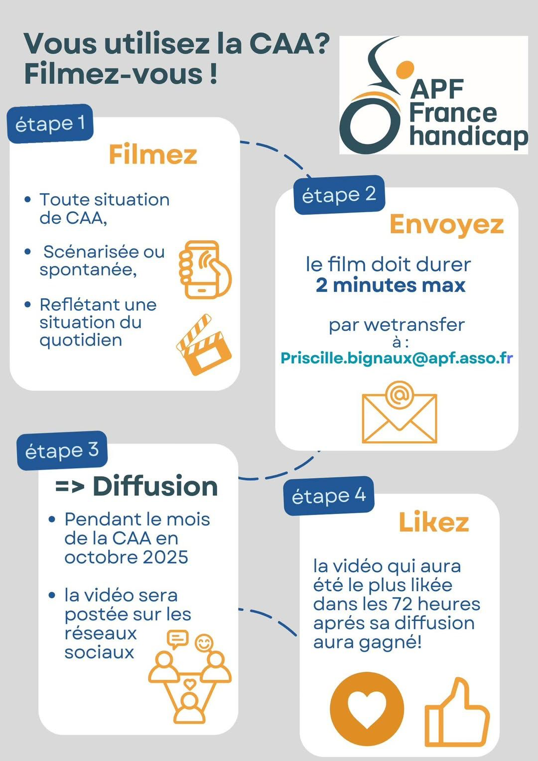 • envoyer le film à priscille.bignaux@apf.asso.fr